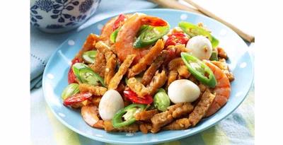 3. Tambahkan udang, masak sampai berubah warna, masukkan tempe, telur puyuh dan petai, aduk rata. Masukkan air, garam, gula pasir, kecap manis, dan penyedap rasa. Masak sampai matang.